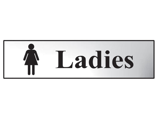Polished brass effect self-adhesive bathroom sign with black text/graphic. Printed using UV resistant inks. Size: 200 x 50mm. Message: 'Ladies'.