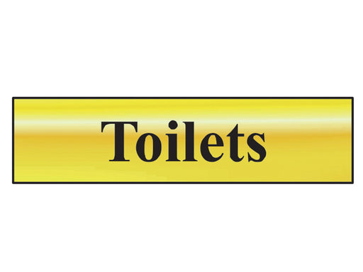 Scan polished brass effect self-adhesive bathroom sign with black text/graphic. Printed using UV resistant inks. Size: 200 x 50mm. Message: 'Toile...