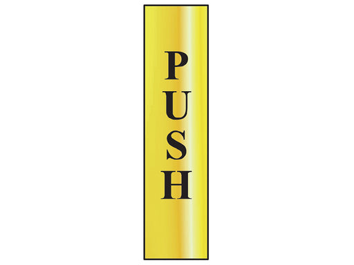 Scan polished brass effect self-adhesive sign with black text/graphic. Printed using UV resistant inks. Size: 200 x 50mm. Message: 'Push' (horizon...