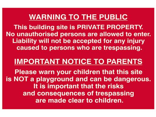 View full detailsBuilding Site Warning to Public & Parents - PVC Sign 600 x 400mm