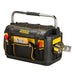 20" open tote with cover for quick access. Multiple pockets, integral tape holder and rigid base/frame. Soft‑grip handle and padded shoulder strap.