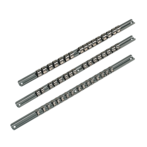 Tidy storage for loose sockets. Carry rail to the job or mount onto wall or toolbox. Handle marked with drive size. Supplied with 14 socket clips....