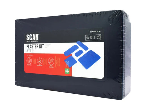 Assorted Hypoallergenic Blue Plasters 120 by Scan.Assorted sizes. Hypoallergenic with strong adhesion and cushioned, non‑stick pads.