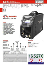Stealth Digi-Mig 200 LCD PFC 9005H Digi-Mig 200 LCD PFC Multi process 110V/230V FEATURES LCD displays 260,000 true colours Power factor more than 0.99 Multiple advantages such as energy saving and wider input voltage Works with 110V and 230V Capable of loading up to 5kg spool Waveform control for added stability of the arc even at low currents Equipped with temperature, voltage and current sensors for high protection M25-3 torch and 2068 regulator included Stealth Digi-Mig 200 LCD PFC